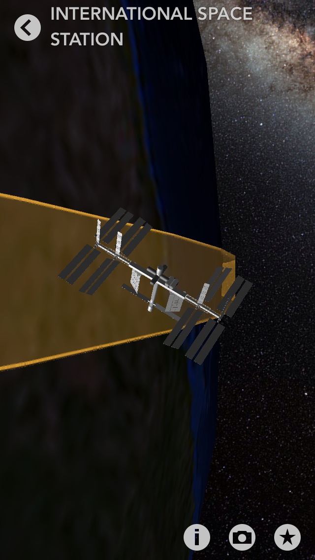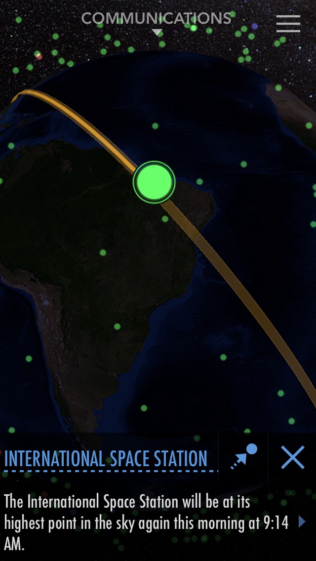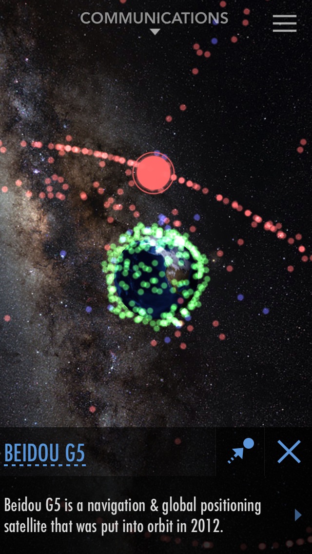 地球を巡る沢山の人工衛星をタップしてその軌道や形や詳しい情報を確認することが出来ます。現在時刻の様子を表示しているようで、衛星の拡大表示を行うと地球を回っている映像が見られます。