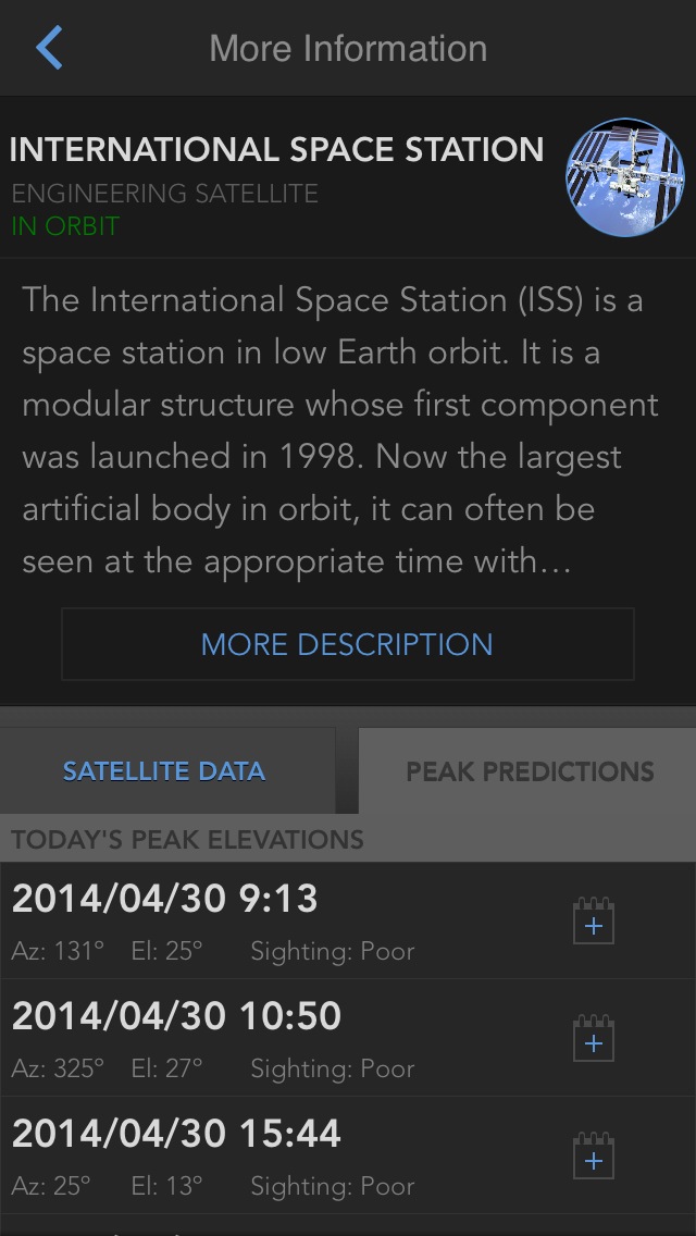 また、その衛星が地球から見える時刻や、今日見える人工衛星の一覧もあります。ただ、空をどのように通過していくかは詳しくは表示されませんので、観測用のアプリにはかないません。背景の宇宙の映像は実際の星空の写真を使っているようで、とても美しいのも特徴です。