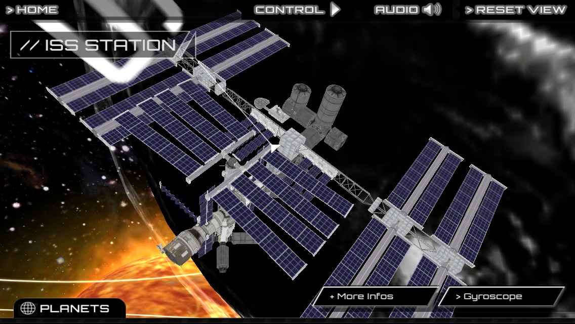 画面下に並ぶ太陽系天体から行ってみたい星を選択すると、そこに移動して自動的に追尾モードに。お手軽に太陽系旅行が出来るアプリです。天体以外にも国際宇宙ステーションなどの人工物もあります。ジャイロを使ったAR的な機能やWikipedia(英語)へのリンクもあります。
