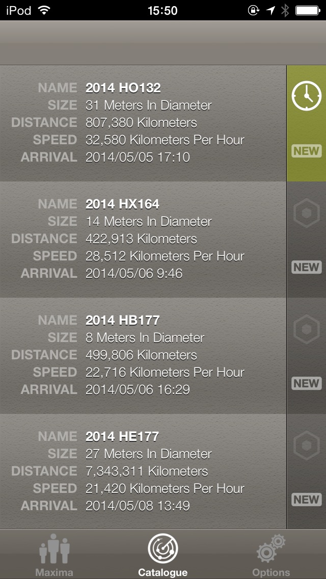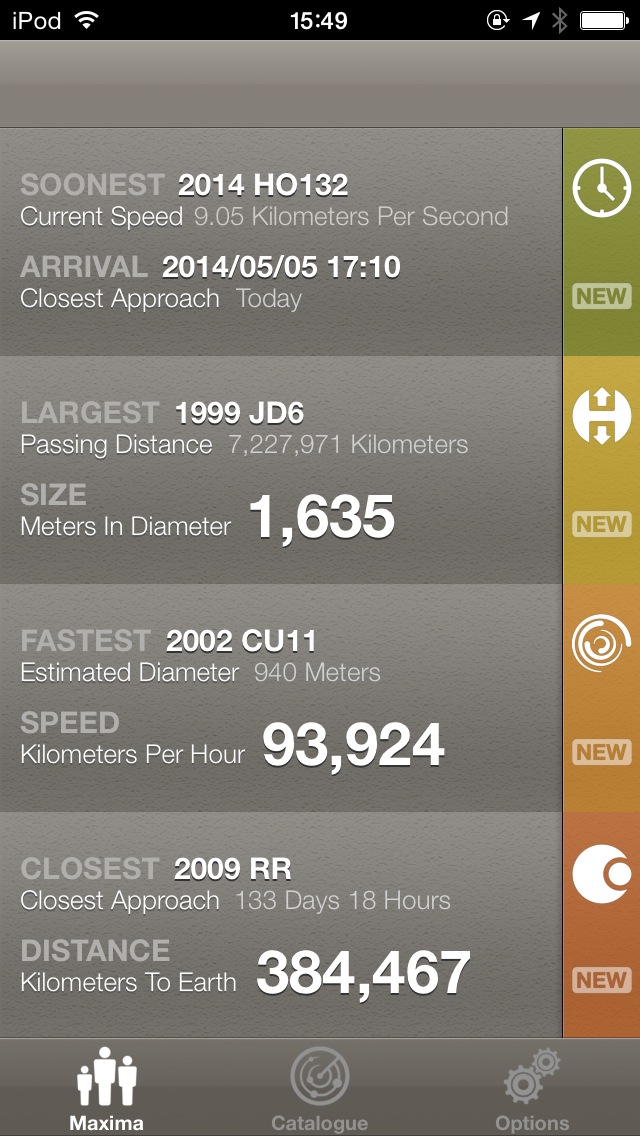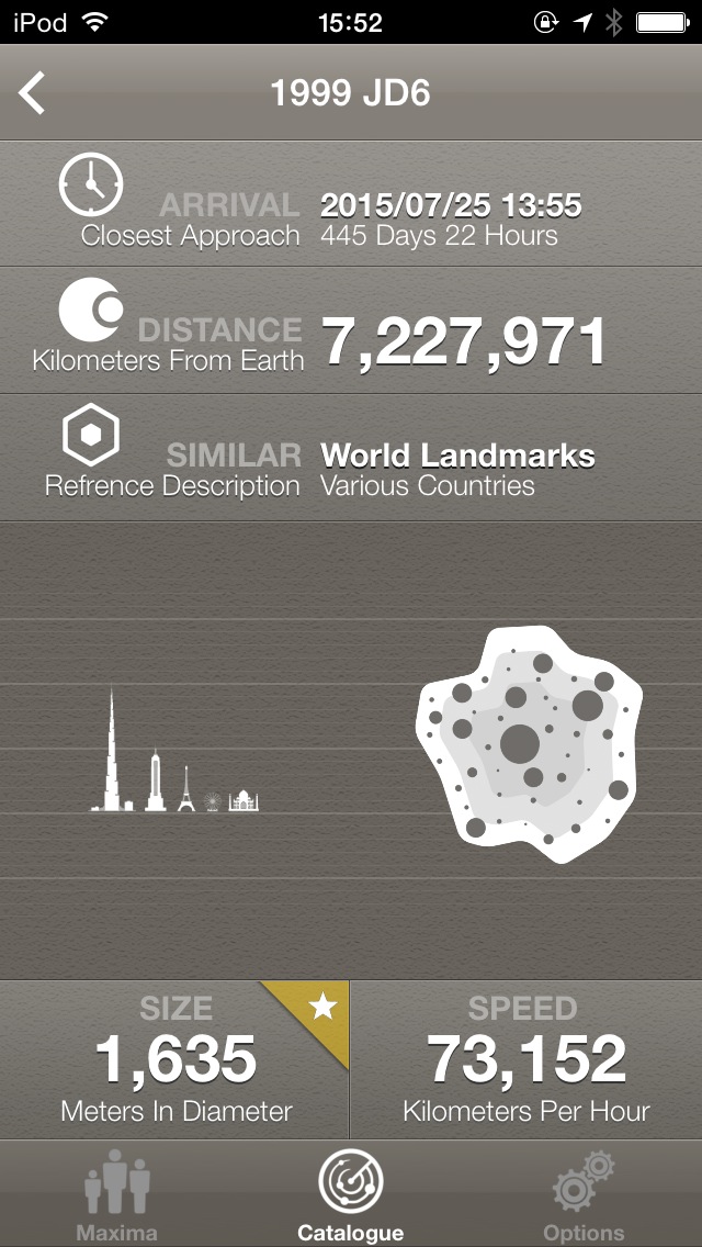 地球近傍天体 ( NEO ) をチェックするためのアプリ。「 Maxima 」タブでは、「 次に接近するもの ( SOONEST ) 」「 最も大きいもの ( LARGEST ) 」「 最も速度が速いもの ( FASTEST ) 」「 最も接近するもの ( CLOSEST ) 」を表示してくれますので、最近の情報を素早く知ることが出来ます。「 Catalog 」タブでは、NEOのカタログを表示。詳細画面では、大きさを身近なものと並べて分かりやすく表示してくれます。軌道も表示してくれればもっといいのですが。
