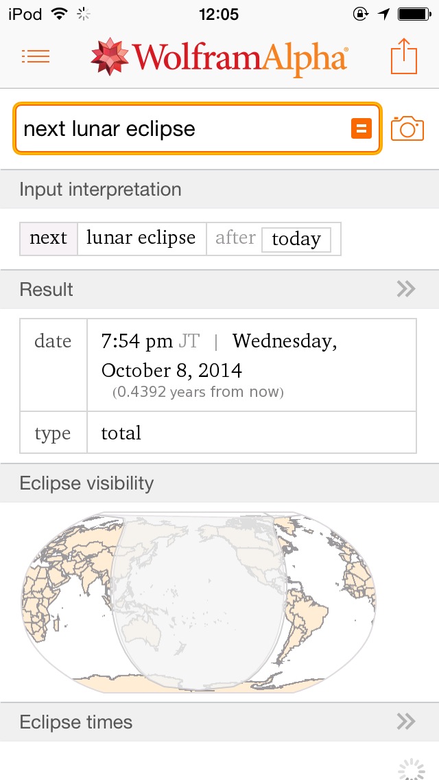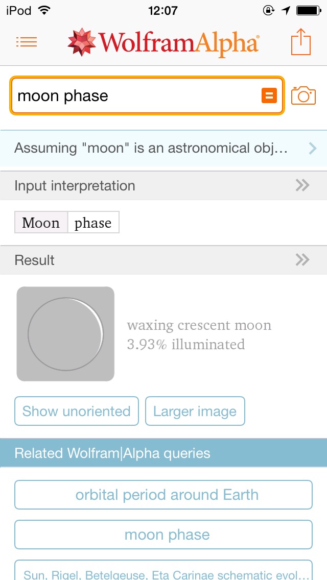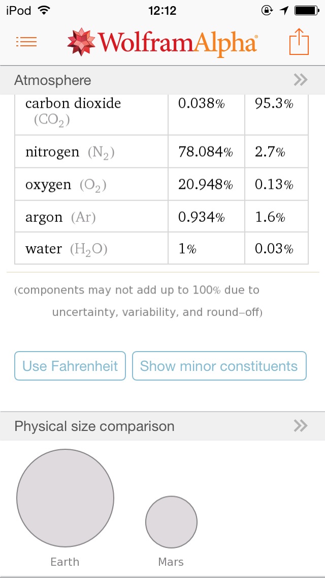 「solar eclipse」と訪ねると日食の情報、「Earth vs Mars」と訪ねると地球と火星の比較、「ISS」と訪ねると国際宇宙ステーションの情報など、どこまで答えてくれるのか色々と質問したくなるアプリです。iPhoneのSiriにも使われいるようですね。